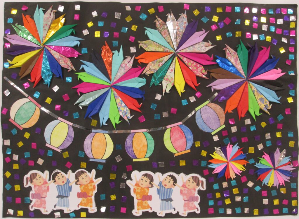 色鮮やかな折り鶴とキラキラの飾りが夏祭りの賑やかさを表現しています❤